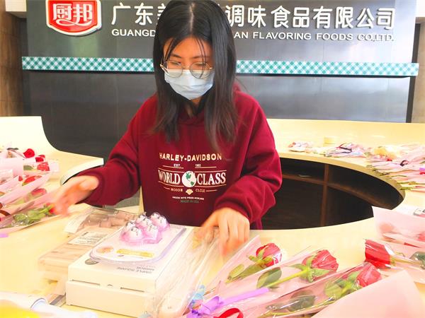 △男同事前来帮忙分发玫瑰花