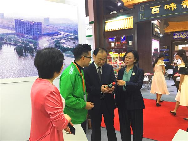 △中国商业联合会姜明会长(右2)和中国调味品协会白燕秘书长(右1)来到厨邦酱油产品展区,关心了解厨邦酱油产品。