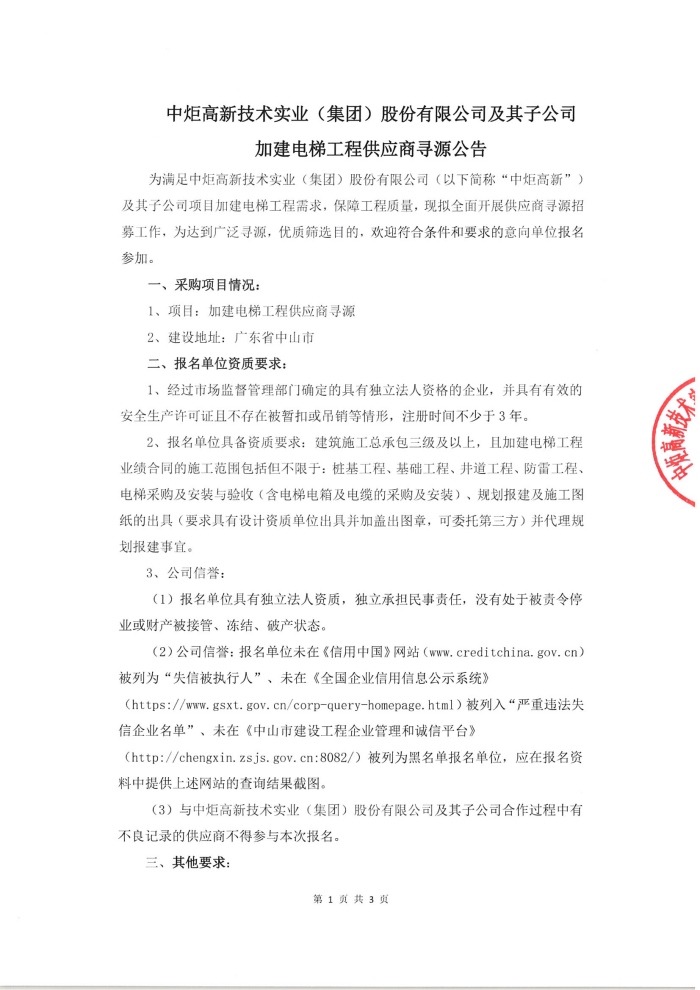云开体app官网入口下载技术实业(集团)股份有限公司及其子公司加建电梯工程供应商寻源公告
