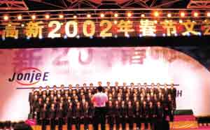 雄壮有力的大合唱《团结就是力量》、《长江之歌》拉开了“2002年云开体app官网入口下载春节文艺晚会”的序幕。公司全体员工首次集体登台演出就征服了全场观众。东和、火炬焊管、科力高、晨生、中炬精工、新士达、美味鲜、理科、丽光、住电、华夏等12家企业先后献出了自己的精彩节目。藏族舞《祝福》、新疆舞《阿拉木汗》、傣族舞《美丽的地方》、双人舞《笛子》舞出了民族风情;现代舞、交谊舞舞出青春气息;物业管理分公司的舞蹈《愚公移山》则舞出了阳刚之气;少儿舞蹈《锉冰舞》和少儿国标舞《恰恰舞》和《牛仔舞》让人感受到了清新的气息;小品《还是好人多》、《职业习惯》则让人忍俊不禁,给人以启发;小乐队演奏《步步高》、《喜洋洋》给观众带来的是清醇的民族音乐;日语小合唱《妈妈之歌》、男声四重唱《回娘家》、男、女独唱《赞歌》、《大地飞歌》、京剧《迎来春色换人间》等让人回味无穷;大型表演唱《常回家看看》表现了现代人蕴含在心中的纯朴情愫。整个晚会超过200人参加了演出。